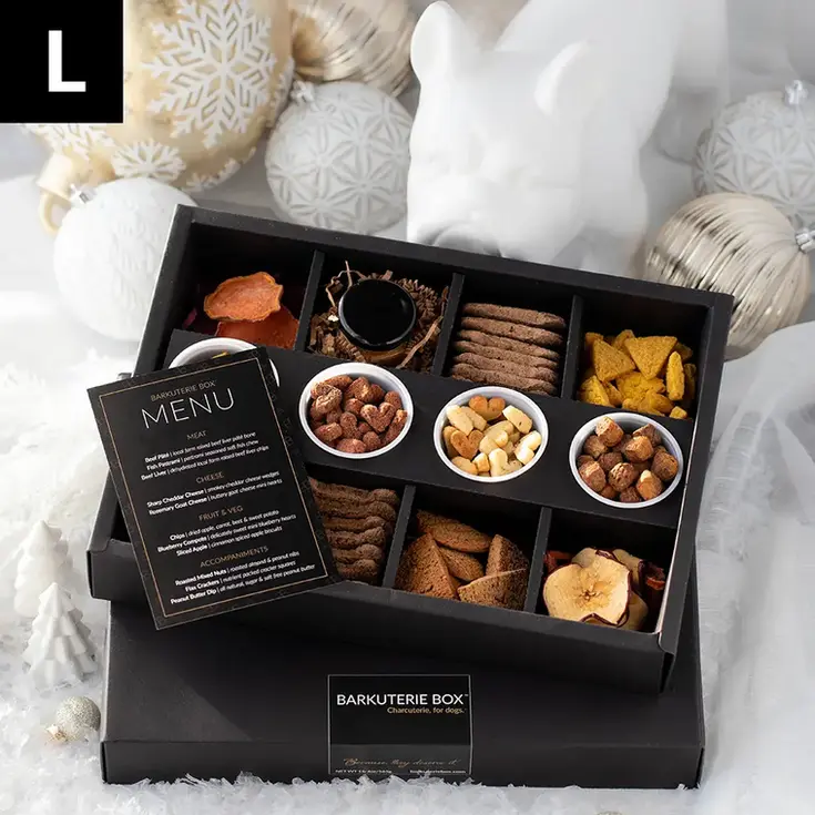Charcuterie-Inspired Barkuterie Dog Treat Box—a gourmet, ready-to-gift experience for dogs and their humans to enjoy together. Thoughtfully handcrafted with all-natural, wheat/chicken/preservative-free ingredients, each box offers an indulgent snacking experience inspired by charcuterie board favorites.% wheat, chicken, and preservative-free. All products are baked or dehydrated so no refrigeration is needed.