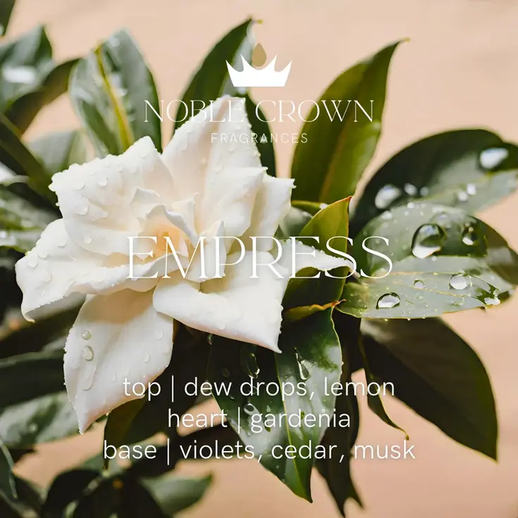 Empress is a soft, graceful fragrance that feels like a dewy spring morning. It opens with gentle lemon and fresh dew drops for a clean and uplifting start. At its heart is a lush gardenia note—elegant and romantic without being overpowering. The drydown brings subtle powdery violets, grounded by cedar and musk. Empress is ideal for daytime wear, when you want something light and floral that still feels polished and intentional.