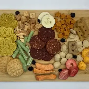 New Larger Board Size! 9.8" x 6.68". This gourmet board is a canine delight, packed with an irresistible array of dog treats. It features freeze-dried chicken breast, green beans, and melt-in-your-mouth sweet potatoes, making it easy for pups of all sizes to enjoy. The tender chicken slices are simply too tempting to pass up. Completing this delectable spread are beef liver crackers, pumpkin-shaped stars, pumpkin paws, peanut butter treats, cheddar puffs and a medley of freeze-dried fruits, including strawberries, bananas, and blueberries. Perfect for pampering that special pooch in your life!